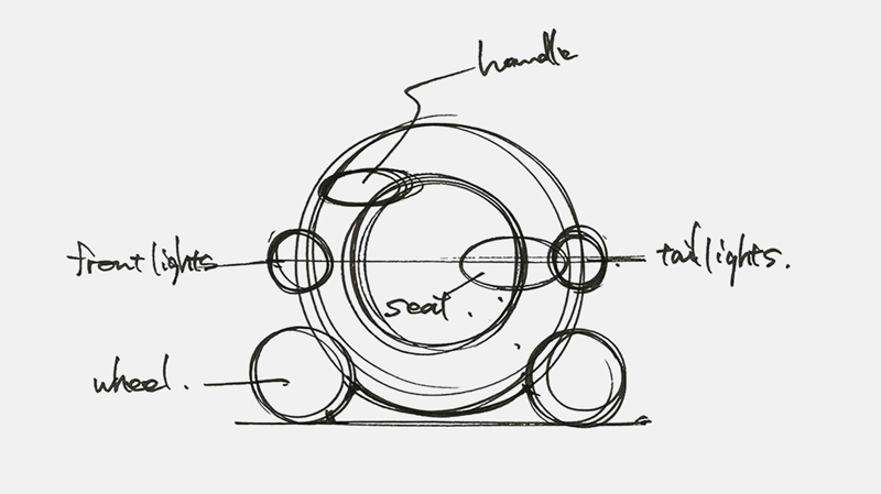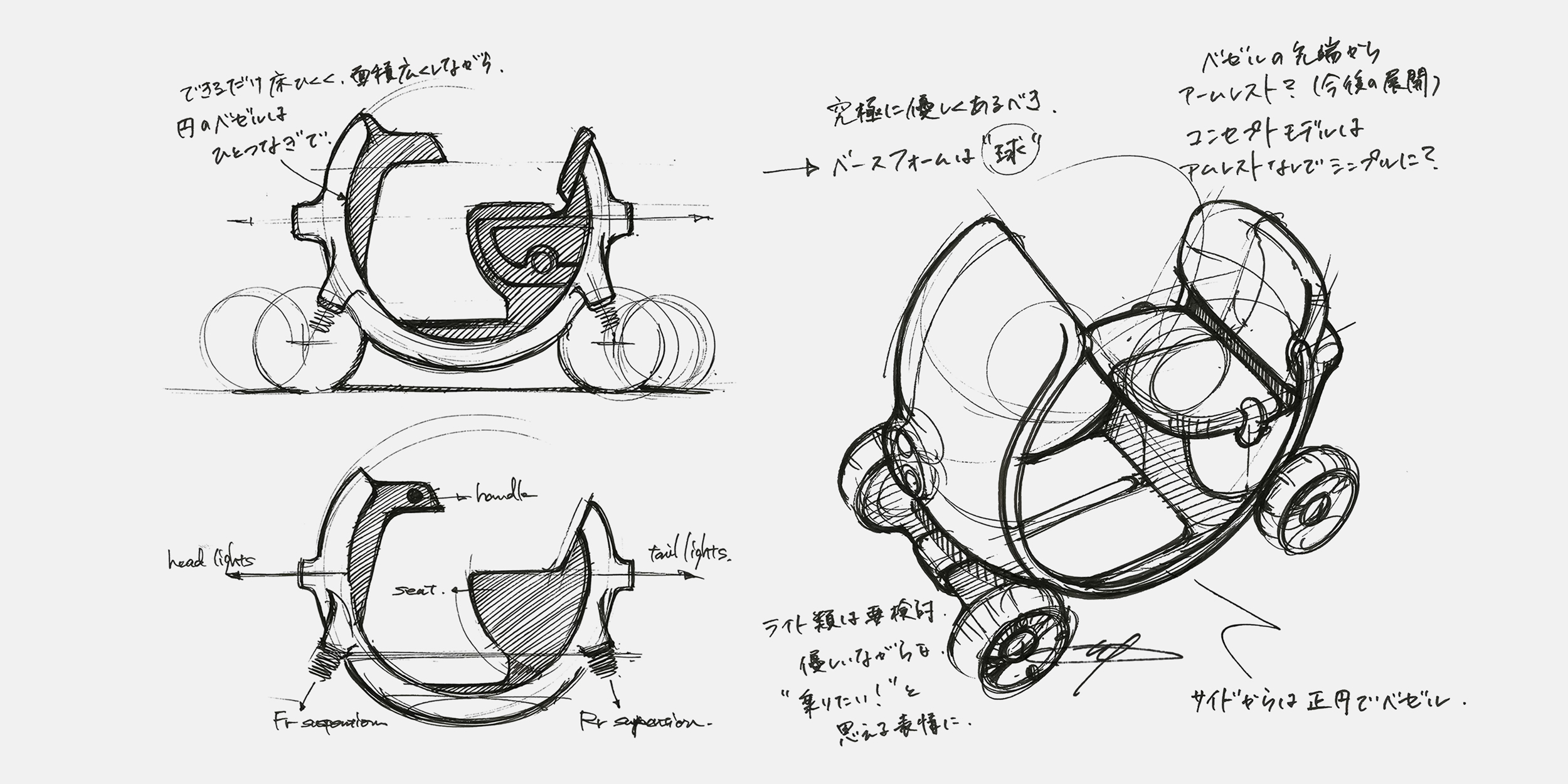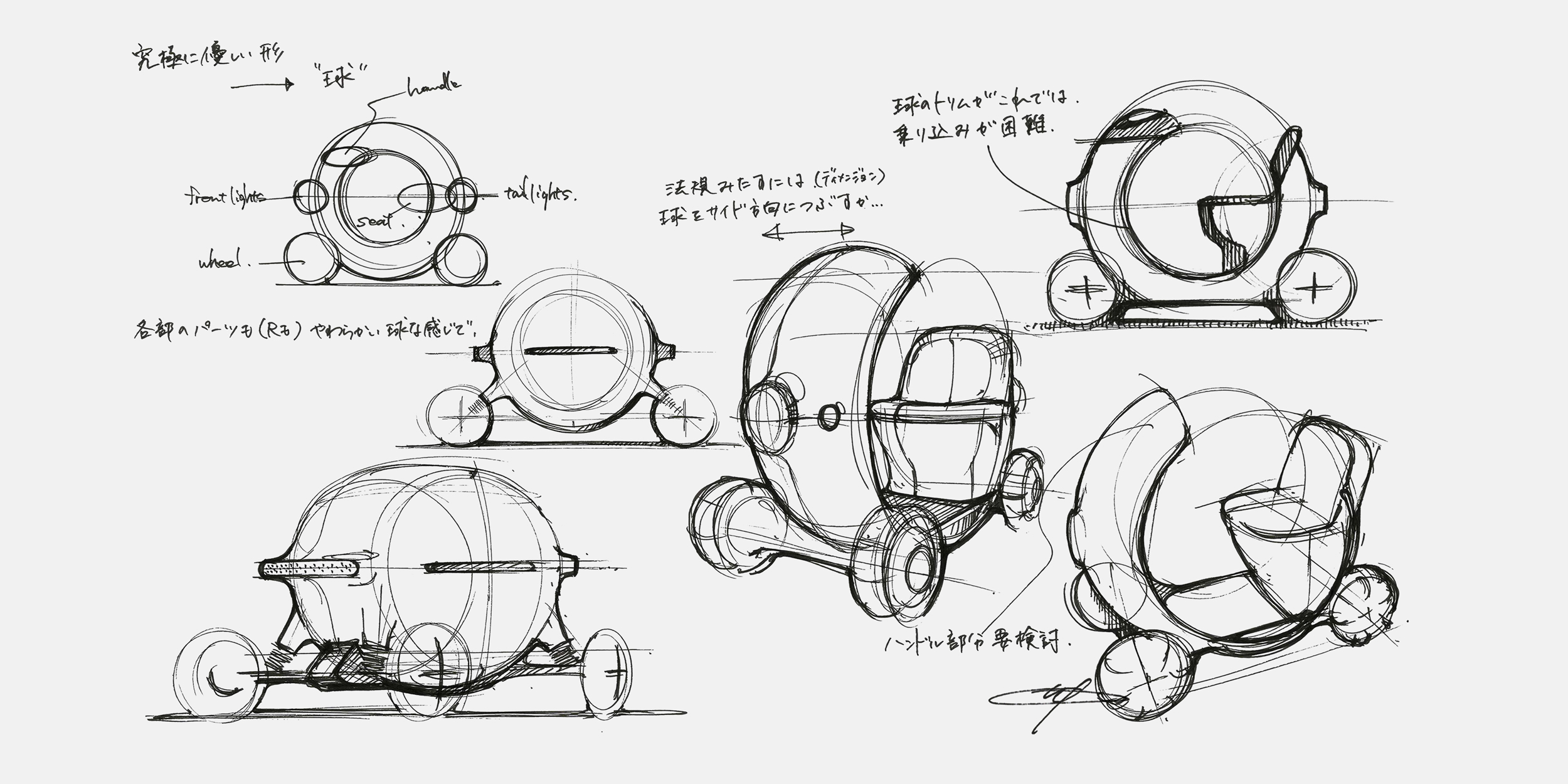 このプロジェクトのデザインテーマは「究極に優しい形=球体」としました。球体からインスピレーションを受け、現代の自動車トレンドや未来的なデザイン思考を取り入れながら、スケッチを通じてボリュームを発展させていきました。乗員にも歩行者にも優しくありながらクールであるという、相反する2つの要素を共存させることに注力しデザインを展開していきました。